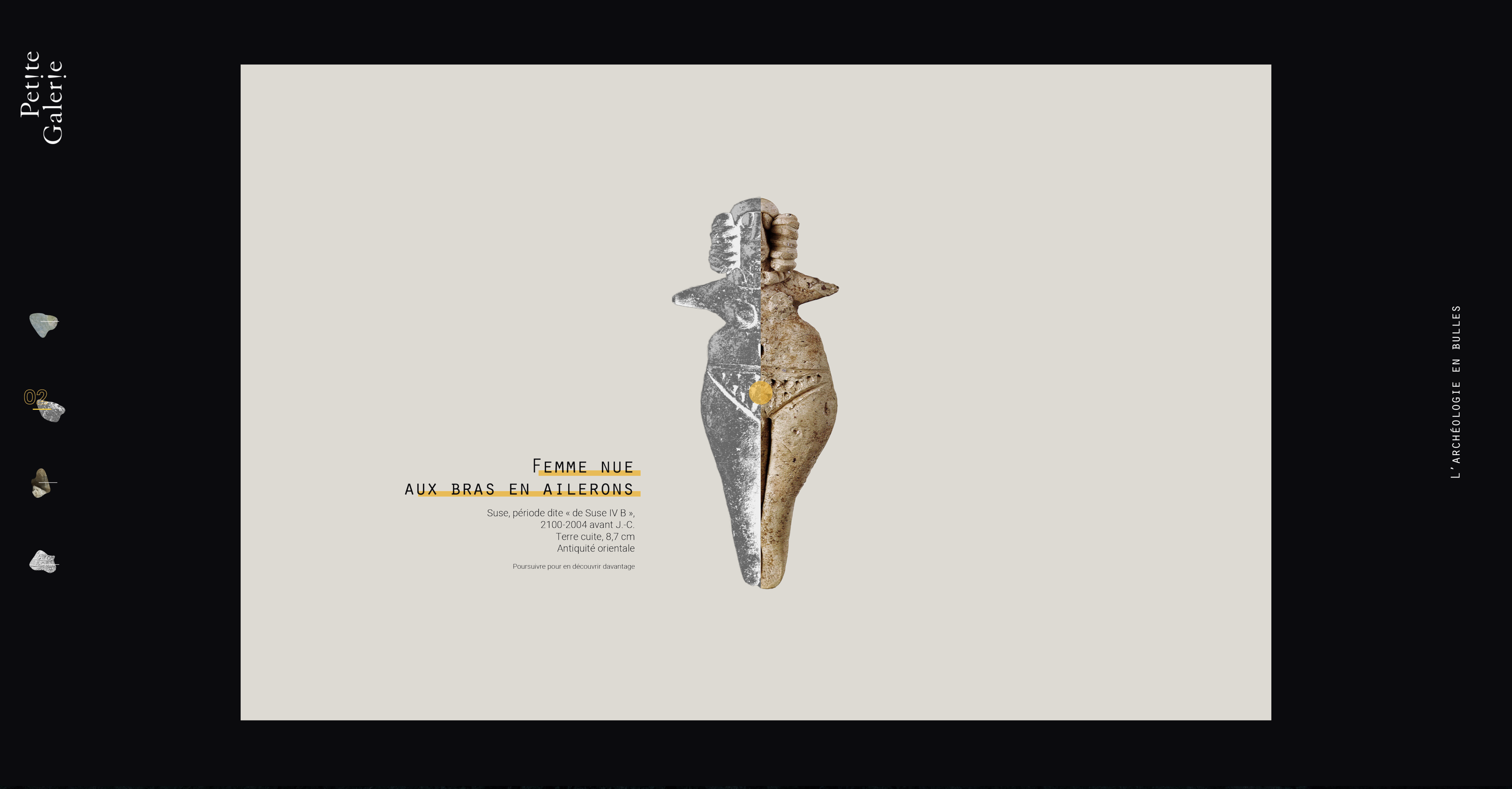 Le Projet : L’utilisateur se met dans la peau d’un archéologue en parcourant les étapes de son travail, à travers un site immersif aux interactions ludiques. Le concept de navigation est celui de la stratification : l’utilisateur s’enfonce dans la profondeur du site au fur et à mesure des étapes, à l’image d’une fouille archéologique.