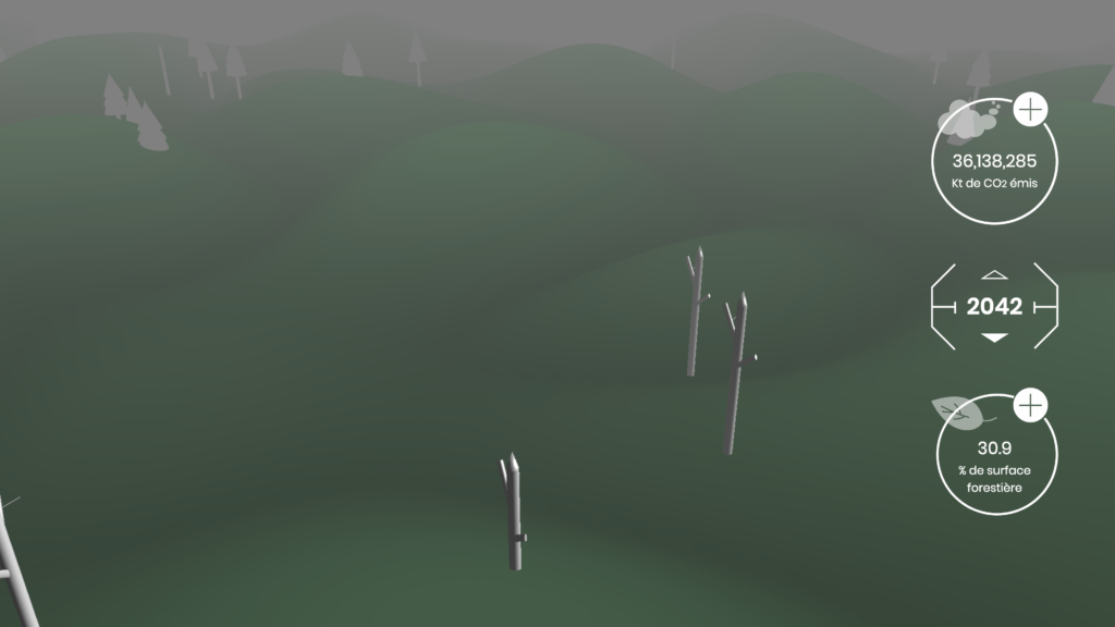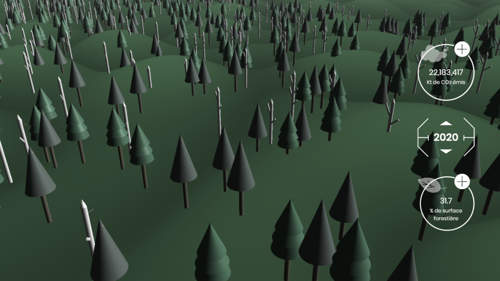 Pitch : Le changement climatique est un enjeu majeur du XXème siècle. Le constat de ces dernières décennies est sans appel : alors que les richesses premières s’épuisent, la pollution augmente. Plongé dans une expérience immersive en 3D, l’utilisateur prend conscience du danger des émissions de CO2 et ses effets sur la forêt dans un futur proche.